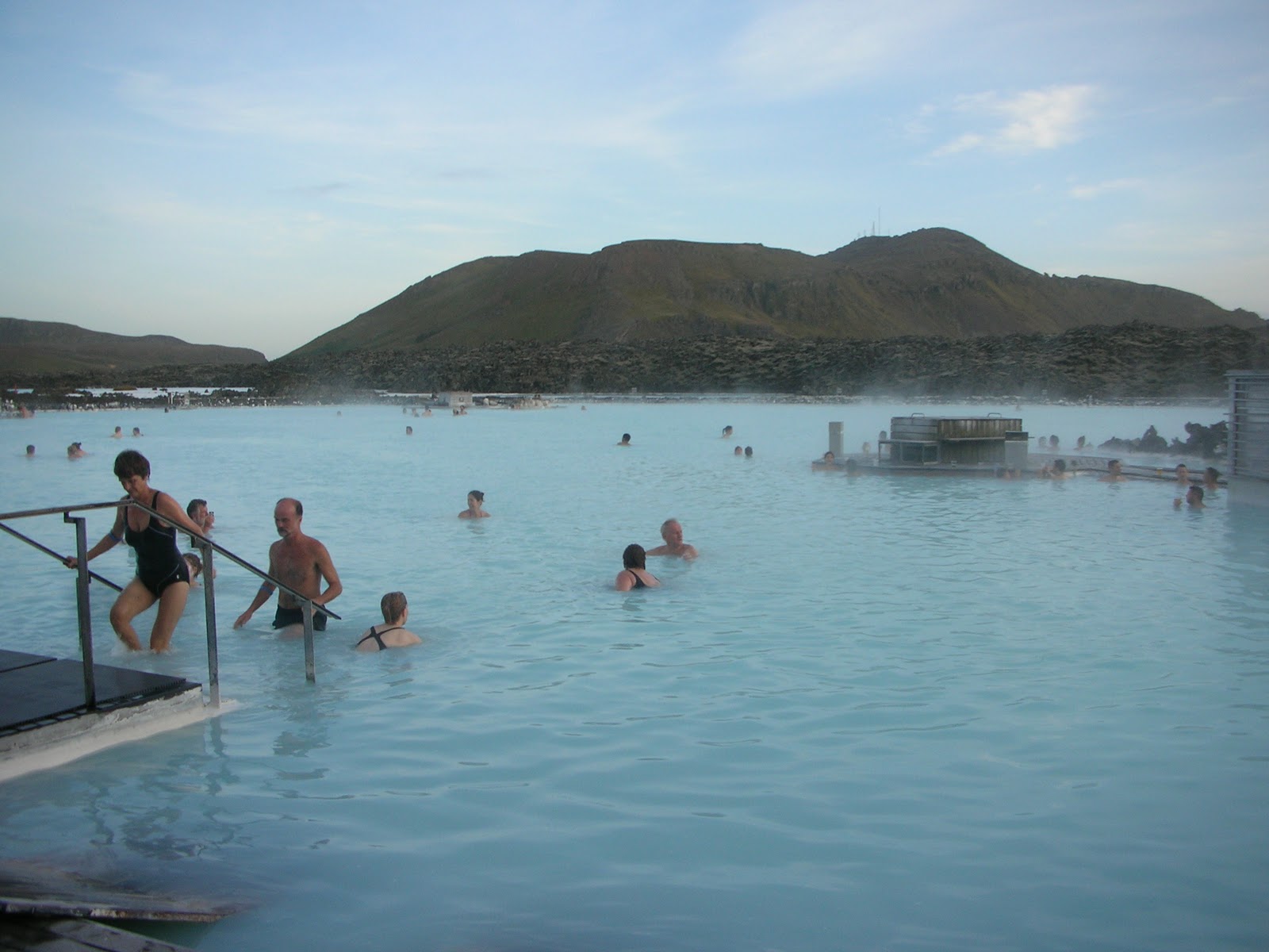 Illan ohjelmassa oli pulikointia Blue Lagoon –ulkoilmauimalassa. Paikka saa vetensä tuliperäisen maan syvyyksistä. Alkujaan vesi on kovassa paineessa 240-asteista. Sitä käytetään sähköntuotantoon ja käyttöveden lämmittämiseen, jonka jälkeen sen lämpötila säädellään uintiin ja killutteluun mukavaan vajaaseen 40 asteeseen. Ei hullumpaa, vai mitä? Ja allas on suuri, kuten kuvasta näkyy. Saunat, suihkut ja vesiputous kuuluvat tietysti asiaan. Samoin veden sisältämät, iholle terveelliset ainekset. Näitä aineita kertyy sedimenttiin, joka näkyy valkeana kerroksena kaikkialla veden reunoilla ja rannoilla. Tätä valkeaa tahnaa suositeltiin myös levitettäväksi iholle, ja niinpä moni uiskentelikin naama valkoisena vaaleansinisessä vedessä, mukaan luettuna TOPNilaiset.